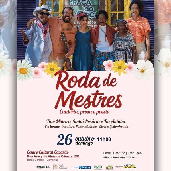 Salve, salve! Viva, viva, gente querida de todo canto! É com muita alegria que a gente vem convidar vocês pra mais uma Roda de Mestres e Mestras, que acontece no Centro Cultural Casarão, dia 26 de outubro, às 11h da manhã.